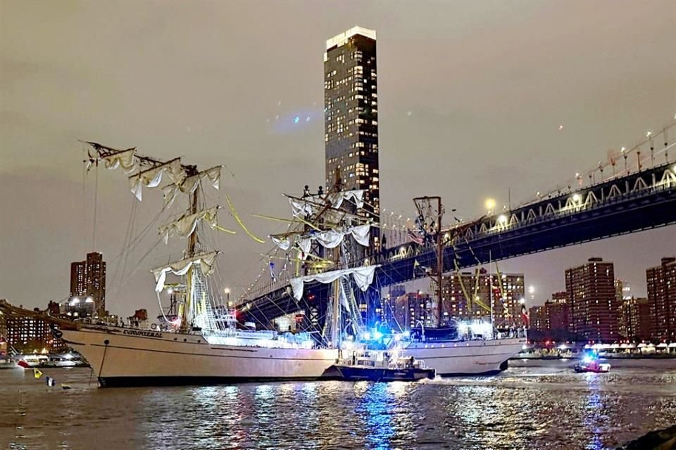 Uno de los factores iniciales que destaca el capitán fue la posición del buque en el muelle. Por razones ceremoniales y visuales, el Cuauhtémoc fue atracado de proa hacia tierra, lo que obligó a la tripulación a zarpar de reversa contra la corriente del East River. Ese primer desafío elevó la complejidad de la maniobra desde el inicio.